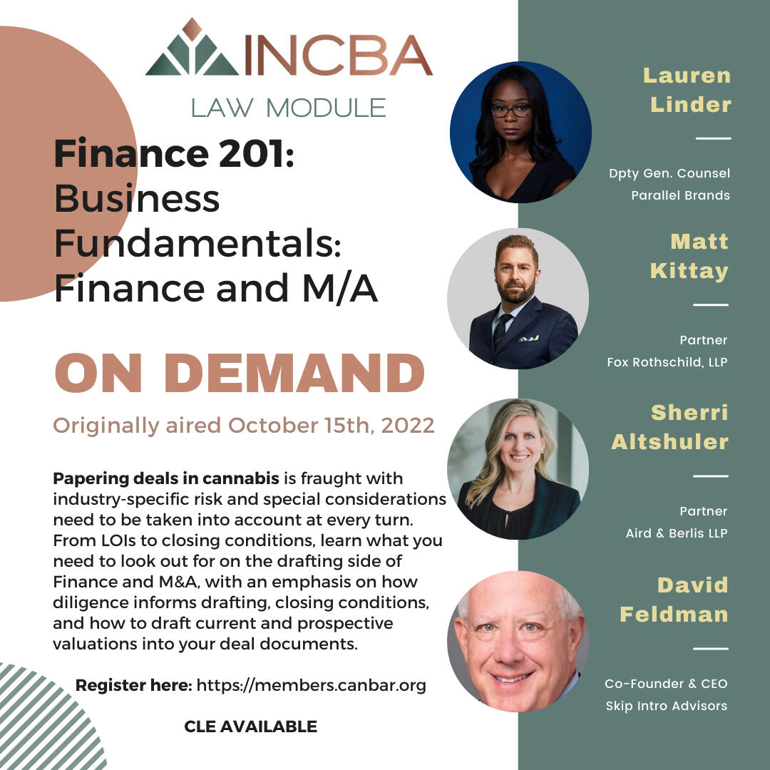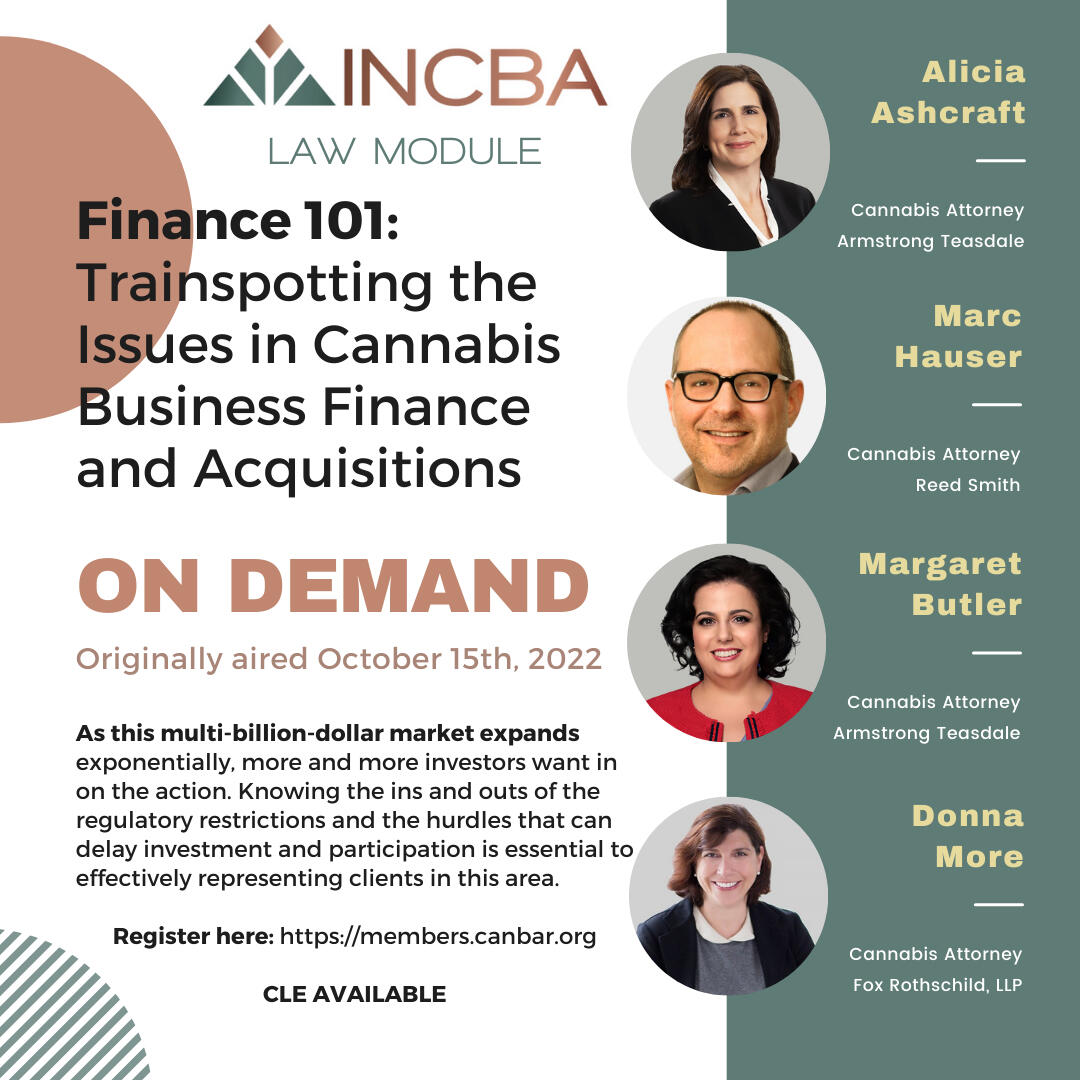 This is the final installment of INCBA’s Business Law - Formation series. After forming a cannabis business, drafting internal documents, and understanding potential disputes, the next natural step is assisting your client with raising money. This panel will discuss the nuts and bolts of raising money including, securities laws, what is a security, registration requirements, exemptions to registration, types of investment vehicles, and investor disclosure documents. The panelists will also walk through the common negotiation points between an issuer and investor that may require changes to the company’s existing company documents