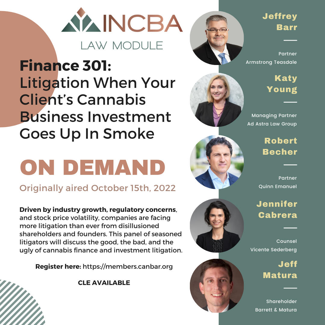 This is the final installment of INCBA’s Business Law - Formation series. After forming a cannabis business, drafting internal documents, and understanding potential disputes, the next natural step is assisting your client with raising money. This panel will discuss the nuts and bolts of raising money including, securities laws, what is a security, registration requirements, exemptions to registration, types of investment vehicles, and investor disclosure documents. The panelists will also walk through the common negotiation points between an issuer and investor that may require changes to the company’s existing company documents